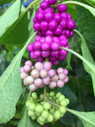 Beautyberry (Callicarpa americana) pictured, is a favorite large shrub that prefers part shade. This is a Florida native plant that blooms with small pink blooms circling the stem where the vibrant purple berries develop and are enjoyed by birds.